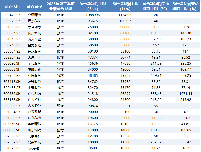 [摘要] 近期,多家A股上市公司披露了2025年前三季度业绩预告。在政策的推动下,市场环境持续向好,部分上市公司业绩表现抢眼。