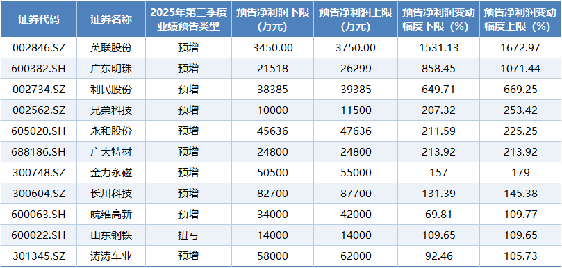 以预计净利润变动幅度上限来看,2家公司预计净利润变动幅度上限超10倍,3家公司预计超5倍,11家公司预计实现**。其中,英联股份(002846.SZ)预计今年前三季度实现净利润3450万元至3750万元,同比增长1531.13%至1672.97%。