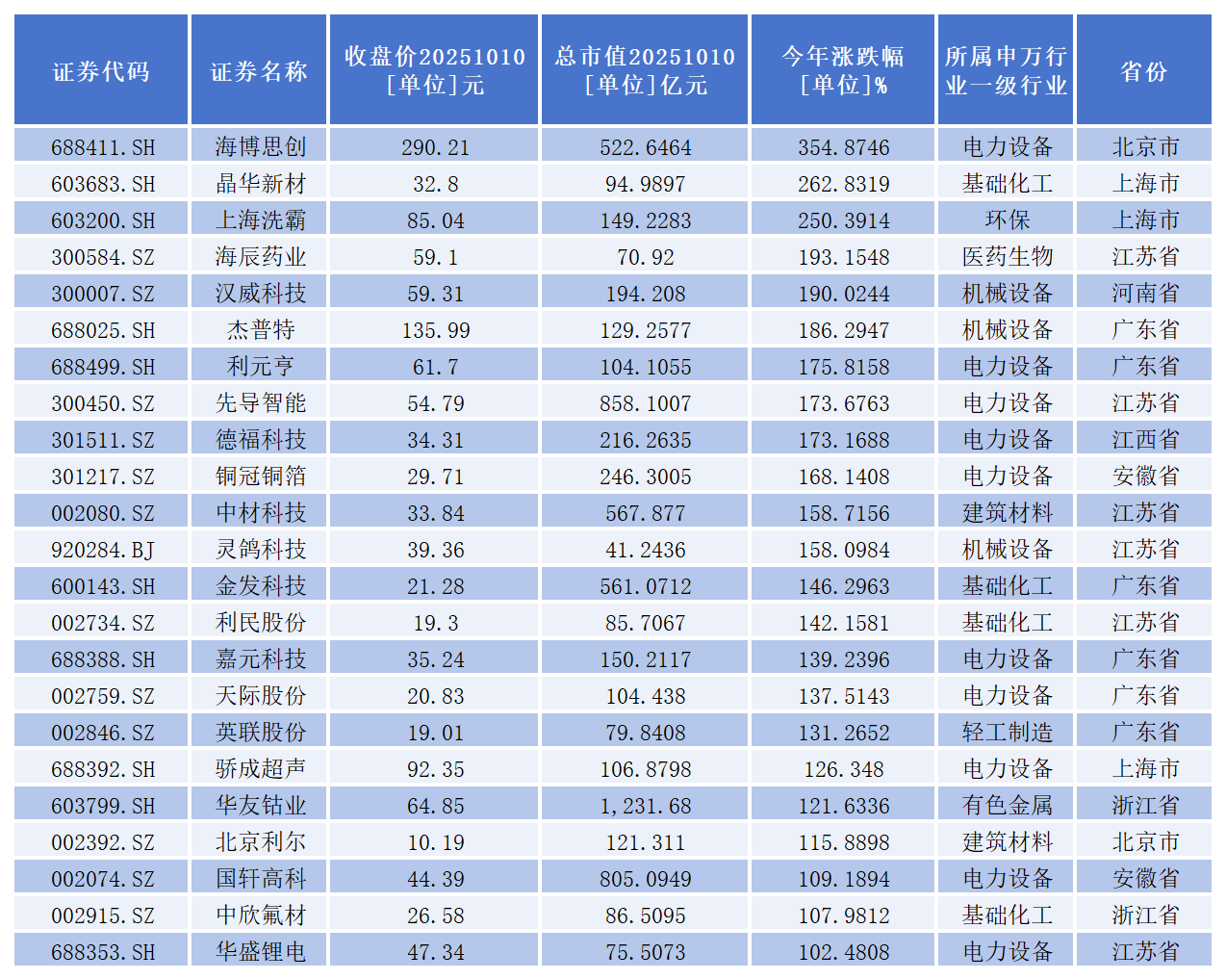 其中,23家上市公司股价成功实现**,海博思创(688411.SH)、晶华新材(603683.SH)、上海洗霸(603200.SH)位居前三,年内股价涨幅均超过200%。