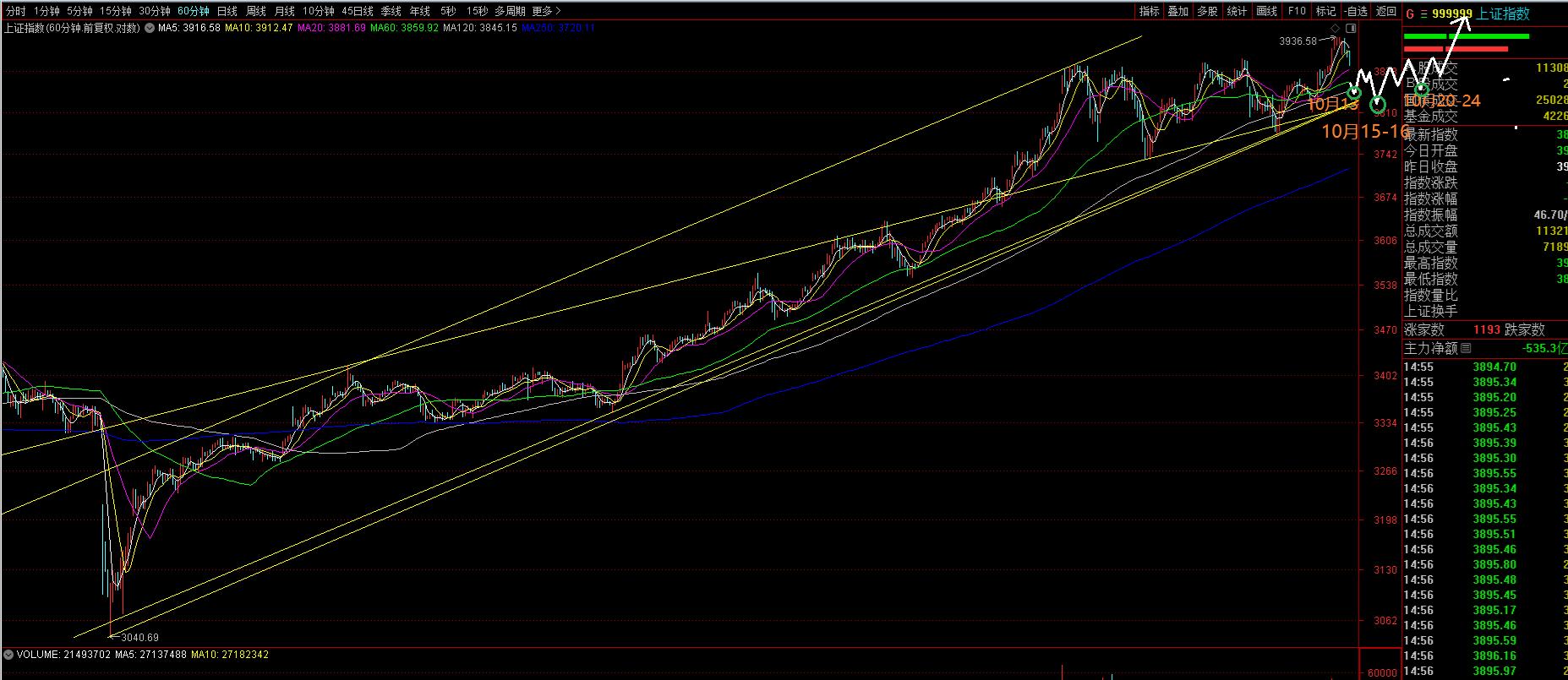 3,我在8月27日微信群公布了未来几个月上证指数日线周期拐点时间,周线周期在当时已经计算,后来在9月26本发内了,即其中包括:10月10当周(10月9-10日,周内其它时间为假期)是周线拐点时间,显然10月9日形成了高点,而不是我九月底以为的低点,所以,还会回调至10月13-17(大概率在10月15),当时预测:“大盘还会再回调筑底于10月13-17日结束调整”也是对的。