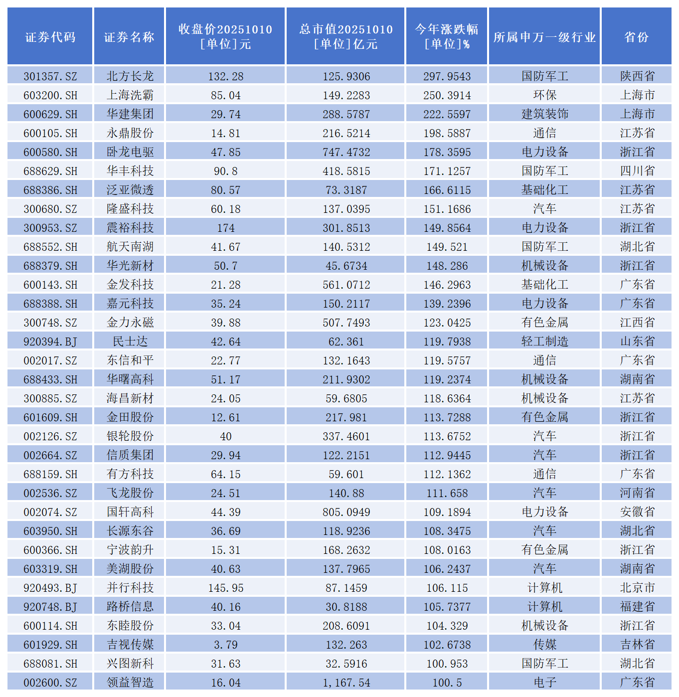 从二级市场表现看,截至10月10日收盘,今年以来,已有33家上市公司股价成功实现**。其中,北方长龙(301357.SZ)、上海洗霸(603200.SH)、华建集团(600629.SH)3家公司股价涨幅均超过200%。