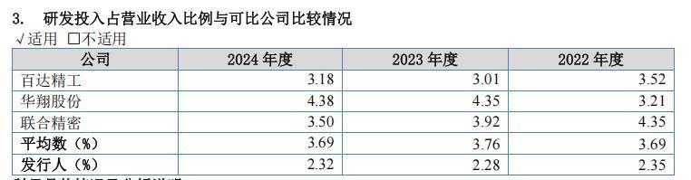 横向比较来看,百达精工、华翔股份、联合精密的研发占营收比均在3.65%以上,在该方面南特科技不及同行。