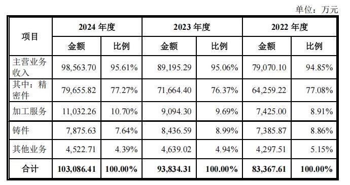 其中,精密件销售收入分别为64259.22万元、71664.40万元、79655.82万元,占主营业务收入的比例均超过70%。