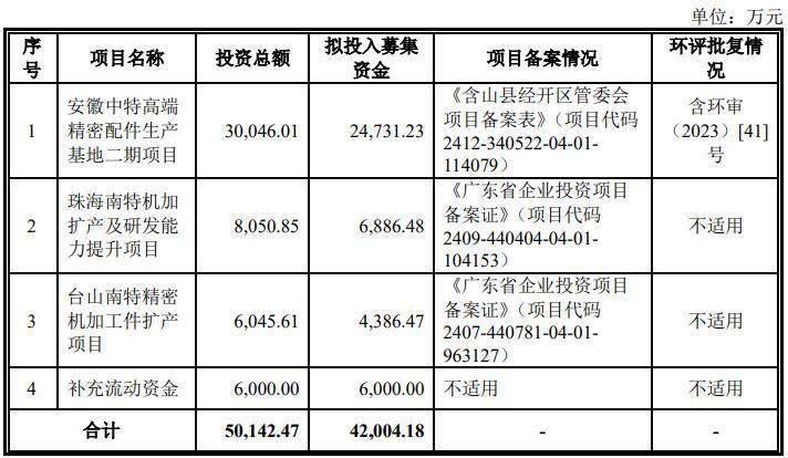 值得注意的是,在2024年的申报稿招股书中,南特科技计划募资4.2亿元,其中,安徽中特高端精密配件生产基地二期项目计划投入募集资金2.47亿元,珠海南特机加扩产及研发能力提升项目计划投入募集资金0.69亿元,台山南特精密机加工件扩产项目计划投入募集资金0.44亿元,另有0.6亿元用于补流。