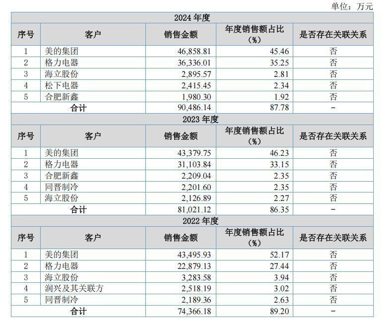2022年至2024年,南特科技前五大客户销售收入占营业收入的比例分别高达89.20%、86.35%、 87.78%。其中,美的集团与格力电器的占比分别达79.61%、79.38%、80.71%,如此高的占比说是公司只给美的、格力“打工”也不为过。