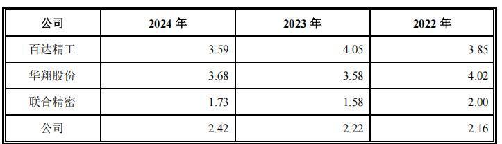 从同行可比公司来看,百达精工2022年至2024年的应收账款周转率分别为3.85、4.05、3.59;华翔股份则分别为4.02、3.58、3.68。与南特科技应收账款周转率较为接近的是联合精密,为2.00、1.58、1.73,原因为二者下游客户较为重叠主要为美的集团、格力电器等压缩机生产商,也就是说,深度绑定美的与格力这样的大客户,公司的回款与周转都会被压制。