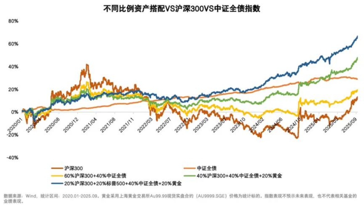 比如图中深蓝色的K线,就是在中证全债的基础上,加入A股、美股和黄金一起搭配。可以发现,这种多资产的组合,就像在固收资产平稳的收益基础上,又把权益资产带来的大幅波动“熨平”了不少,不管是收益表现,还是抗波动水平,都比单一资产表现更胜一筹。