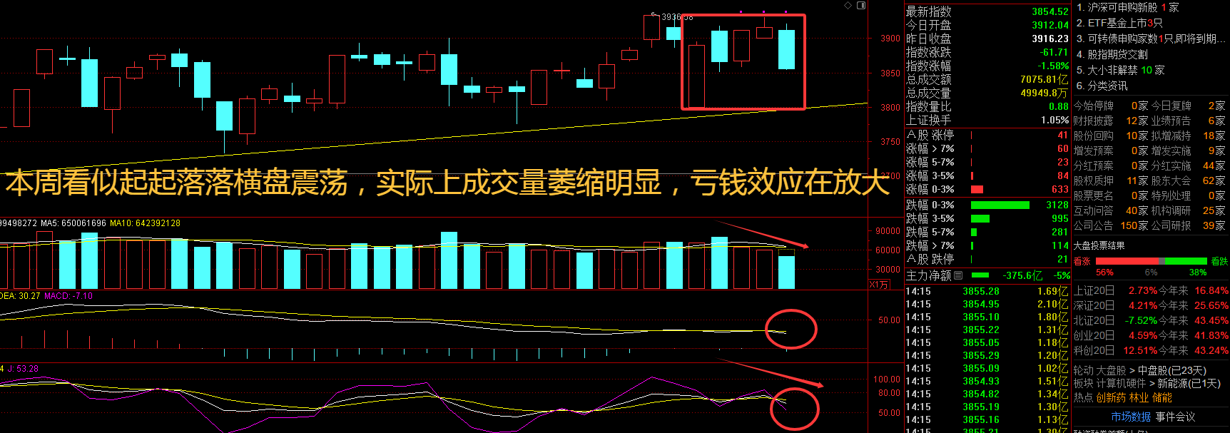 上证指数周五出现下跌走势,周线已经是连续8周横盘震荡了,这个位置的盘面走势相对较差,整体行情走势仍然较弱,个股行情明显,但是连续拉升个股较少。从宏观环境来看,市场对未来的预期依旧是GDP 增长弱弹性+PPI同比处于负值区间的组合,这对于产业转型的叙事来说仍然处于顺风期。从估值驱动走向盈利验证,因此未来行情的持续性取决于未来以AI、创新药为代表的产业趋势验证。接下来注意上证指数能否在3900点之上稳住。