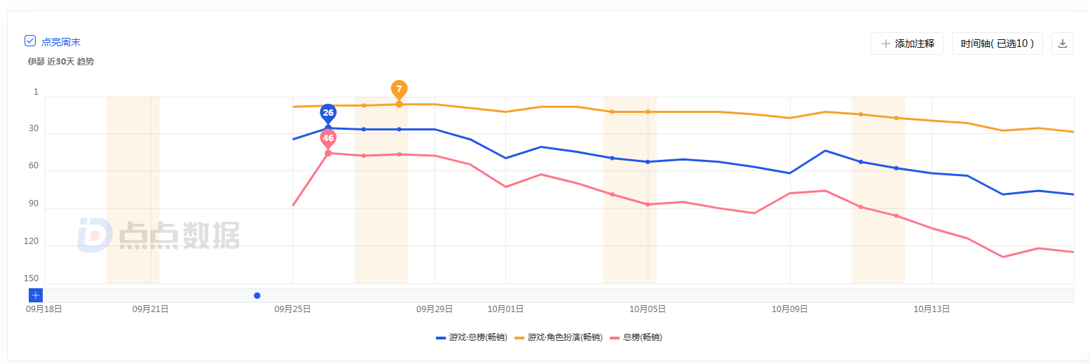 从畅销表现来看,9月26日,《伊瑟》在中国内地iOS游戏畅销榜排名最高达到26名,此后排名波动下行。