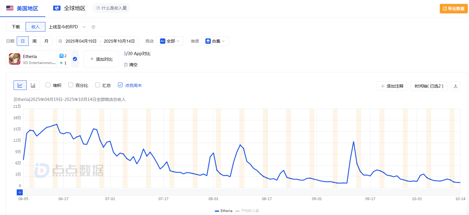 更早之前的2025年6月,《伊瑟》已上线北美洲、欧洲、东南亚等市场。以美国市场为例,在经历上线之初的收入高峰后,近期流出自然回落。