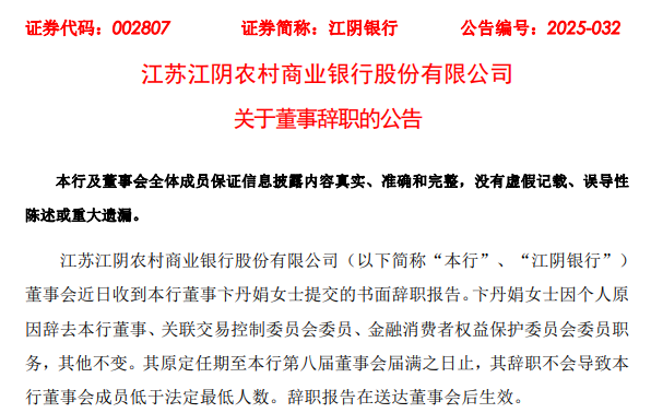 公告显示,江阴银行董事会近日收到本行董事卞丹娟女士提交的书面辞职报告。卞丹娟女士因个人原因辞去本行董事、关联交易控制委员会委员、金融消费者权益保护委员会委员职务,其他不变。