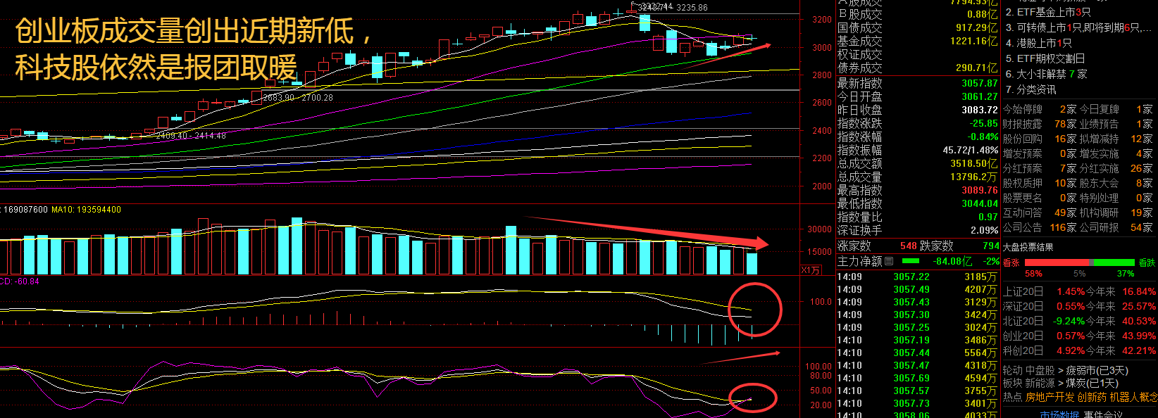 创业板指数周三仍然是大涨大跌的局面,反弹2日后市场出现调整,这毕竟是“慢牛”行情,涨涨跌跌也不奇怪,只不过外盘新高,A股大概率还是震荡为主。截至目前,A股共有140家上市公司对外发布前三季度业绩预告,117家预喜,预喜比例约为83.57%。无论从三季报还是三季报业绩预告来看,半导体、人工智能、消费电子、通信等科技类公司业绩都持续向好。接下来注意创业板指数能否在3100点之上稳住。