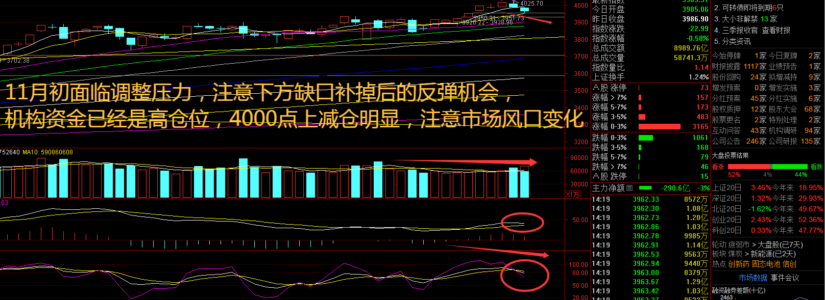 上证指数周五出现明显的调整走势,有明显向下补缺口的迹象,每次会谈后都会引来市场一定的恐慌,之后也会有修复,目前这轮调整的幅度有多大,11月初可以技术分析出来。A股上市公司三季报披露收官,已披露三季报的5414家上市公司中,近八成前三季度实现盈利,超五成实现净利润增长。一年多次分红已成为常态,209家上市公司提出三季度分红方案,合计计划分红382亿元。接下来注意上证指数能否在4000点之上稳住。