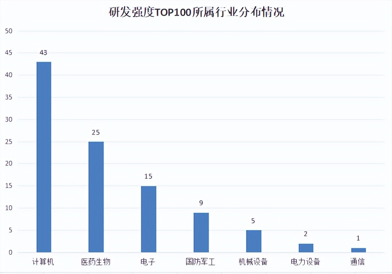 分行业来看,计算机、生物医药、电子等行业研发强度较高。在研发强度TOP100企业中,计算机行业有43家,医药生物行业有25家,电子行业有15家。