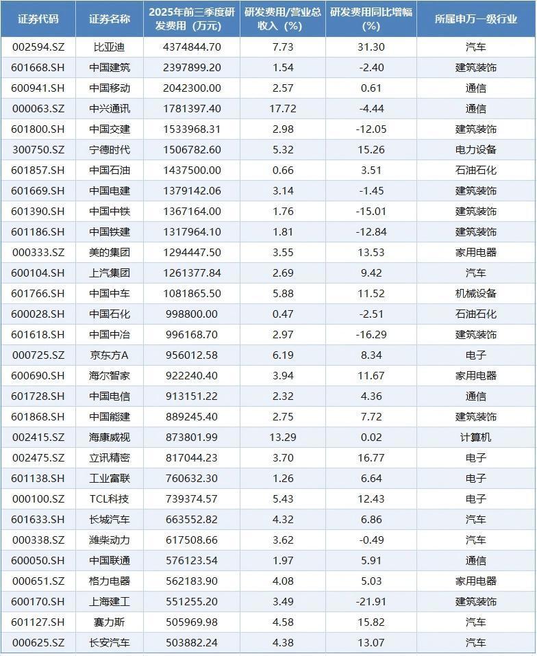除上述企业外,中兴通讯(000063.SZ)、中国交建(601800.SH)、宁德时代(300750.SZ)、中国石油(601857.SH)、中国电建(601669.SH)等公司的研发投入也排名靠前,并且都超过了百亿元。