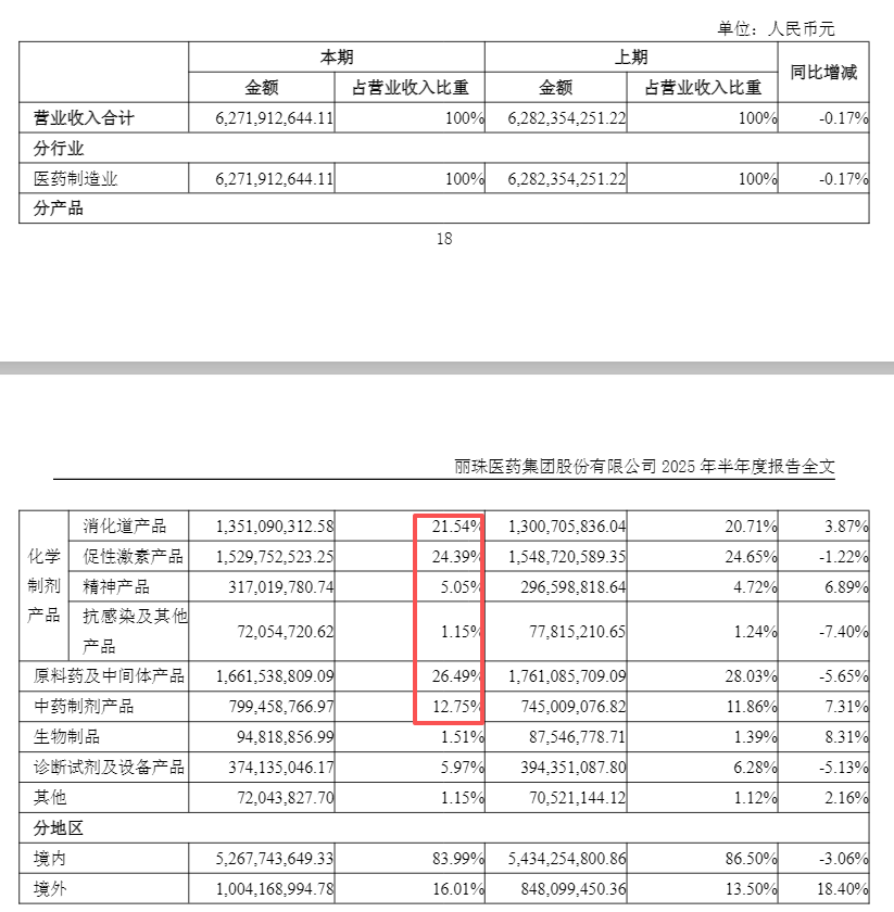 根据丽珠集团2025年中报,丽珠集团上半年来自化学制剂产品的收入占比超过50%,包括消化道产品、促性激素产品、精神产品等。来自原料药及中间体产品、中药制剂产品的收入占比也相对较高,分别达到26.49%、12.75%。