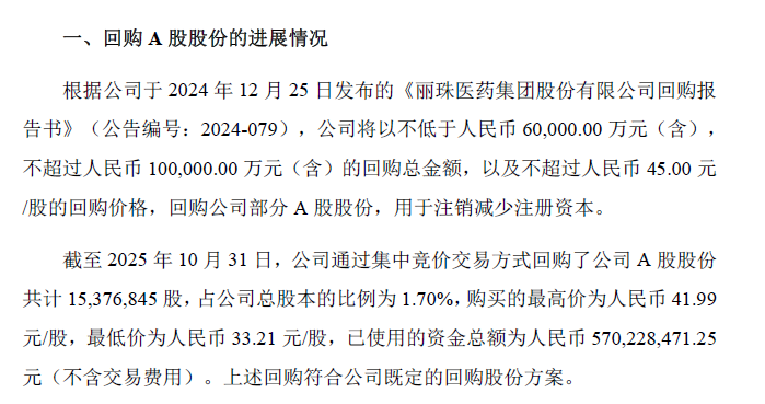 11月3日,丽珠集团(000513.SZ)公告显示,截至2025年10月31日,公司通过集中竞价交易方式回购了公司A股股份共计15,376,845股,占公司总股本的比例为1.70%,耗资约5.7亿元。根据此前公告,公司回购的股份将用于注销减少注册资本。