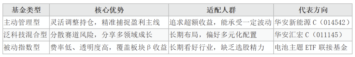 · 核心配置:风险承受能力较强、投资周期6个月以上的投资者,可将华安新能源C(014542)作为新能源板块核心配置,通过定投方式摊薄成本,分享锂电池与储能赛道的盈利修复红利;