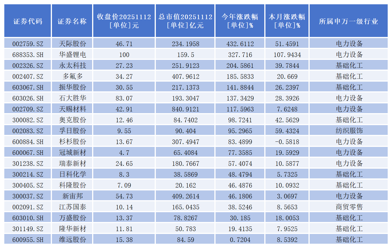 从二级市场表现看,今年以来,截至11月12日收盘,19家公司股价全部实现上涨。其中,天际股份、华盛锂电、永太科技、多氟多、振华股份、石大胜华、天赐材料7家公司股价已经成功实现**。