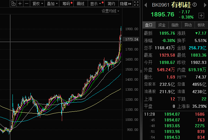 连日来,A股有机硅板块涨幅近5%,成分股华盛锂电(688353.SH)、富祥药业(300497.SZ)、东岳硅材(300821.SZ)、康鹏科技(688602.SH)涨幅居前。