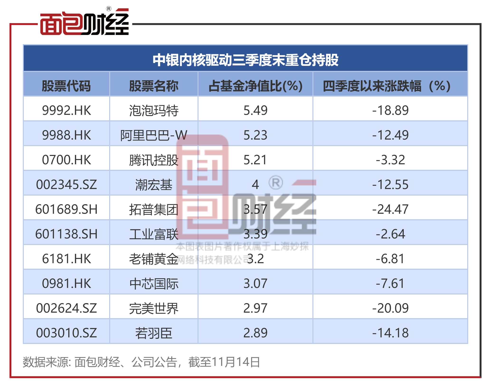 根据2025年三季报,该基金的前十大重仓股中包括泡泡玛特、阿里巴巴、潮宏基等。截至11月14日数据,基金重仓股自四季度以来股价均出现下跌,其中拓普集团、完美世界股价下滑超过20%。