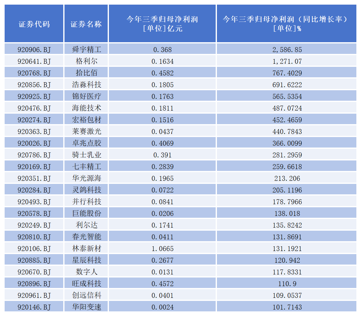 其中,舜宇精工、格利尔、拾比佰、浩淼科技、锦好医疗、海能技术、宏裕包材、莱赛激光、卓兆点胶、骑士乳业、七丰精工、华光源海、灵鸽科技、并行科技、巨能股份、利尔达、春光智能、林泰新材、星辰科技、数字人、旺成科技、创远信科、华阳变速23家公司前三季度归母净利润同比增长超过100%。