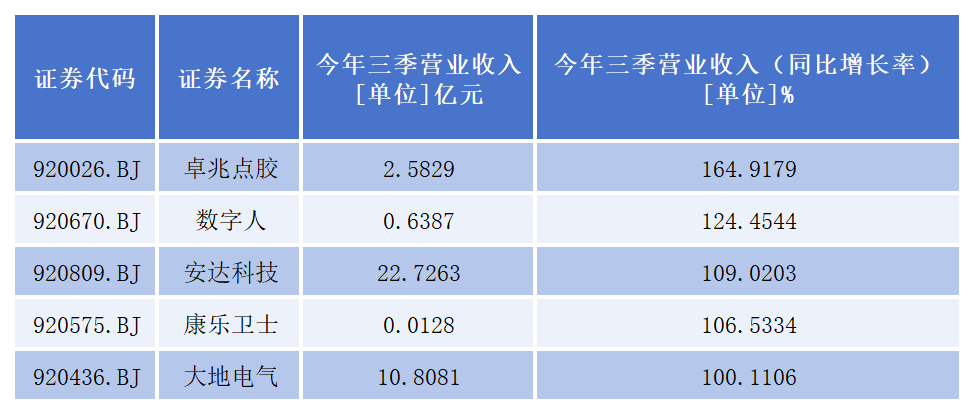 其中,卓兆点胶、数字人、安达科技、康乐卫士、大地电气5家公司三季度营业收入同比增长超过100%。