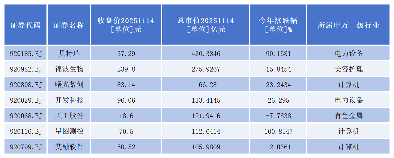 贝特瑞、锦波生物、曙光数创、开发科技、天工股份、星图测控、艾融软件7家公司总市值超过百亿。