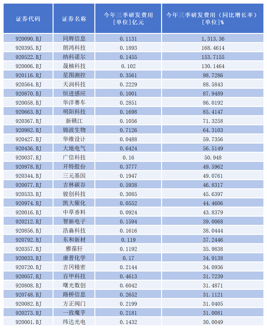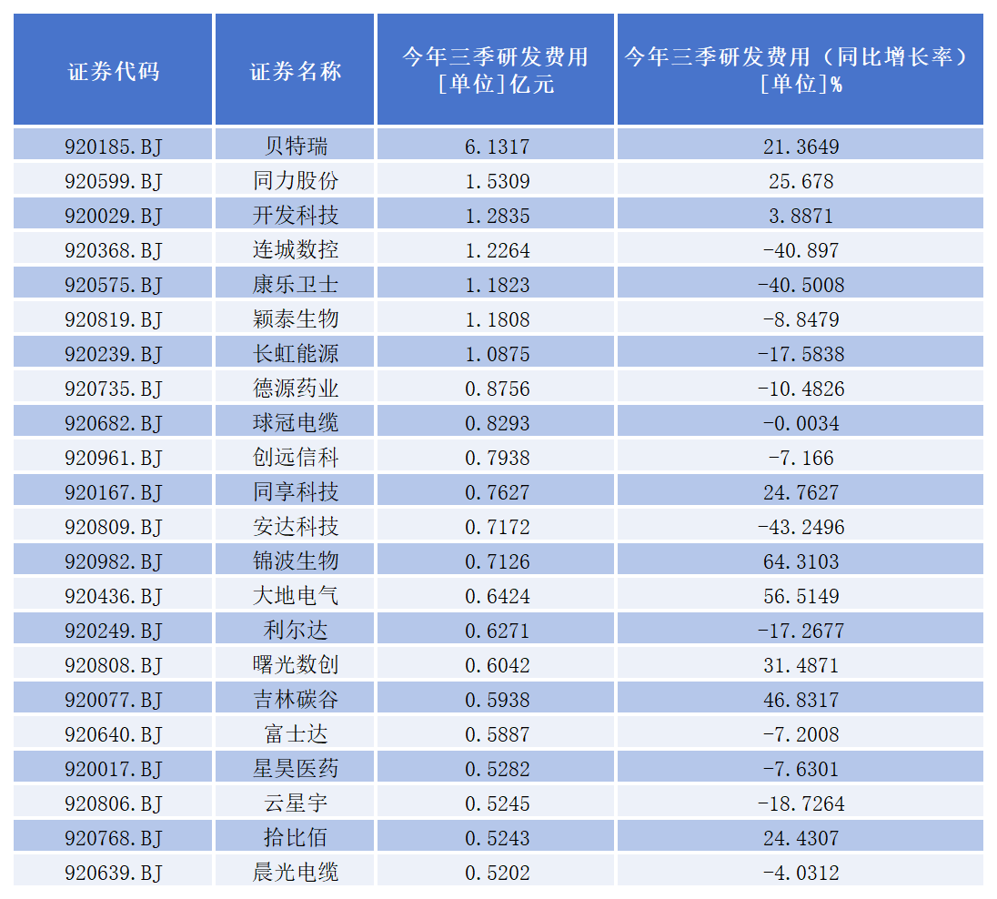 前三季度,158家公司研发投入实现同比增长。其中,同辉信息、朗鸿科技、纳科诺尔、晟楠科技、星图测控、天润科技、恒进感应、华洋赛车、明阳科技、新赣江、锦波生物、华维设计、大地电气、广信科技、开特股份、三元基因、吉林碳谷、骏创科技、凯大催化、中草香料、智新电子、浩淼科技、东和新材、雅葆轩、康普化学、吉冈精密、百甲科技、曙光数创、路桥信息、方正阀门、一致魔芋、纬达光电32家同比增幅超过30%。