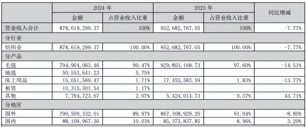 从业务层面来看,毛毯制造业务占据了公司约90%的营收比例,是绝对的主营业务。其次是地毯业务,占营收比也仅有5%左右,床上用品等业务占比则更少。与此同时,真爱美家近九成收入来自海外市场,凭借“世界超市”浙江义乌的地理优势,产品远销中东、北非和南非等地。