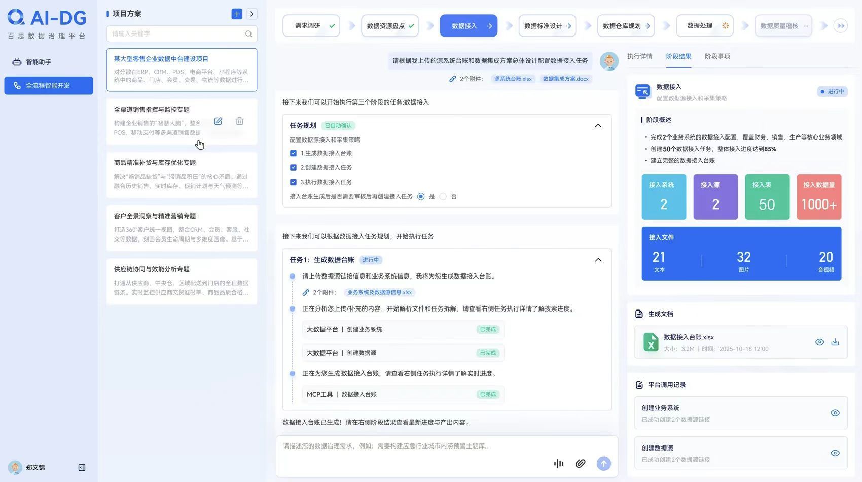 平台采用“对话式治理”新模式,用户通过自然语言描述业务需求,系统即可精准理解意图并自动调度多智能体协同工作,完成数据探查、标准制定、模型设计与集成开发的全链路任务。该创新交互将传统数月的设计开发周期压缩至天级,显著提升业务团队参与深度和治理效率。