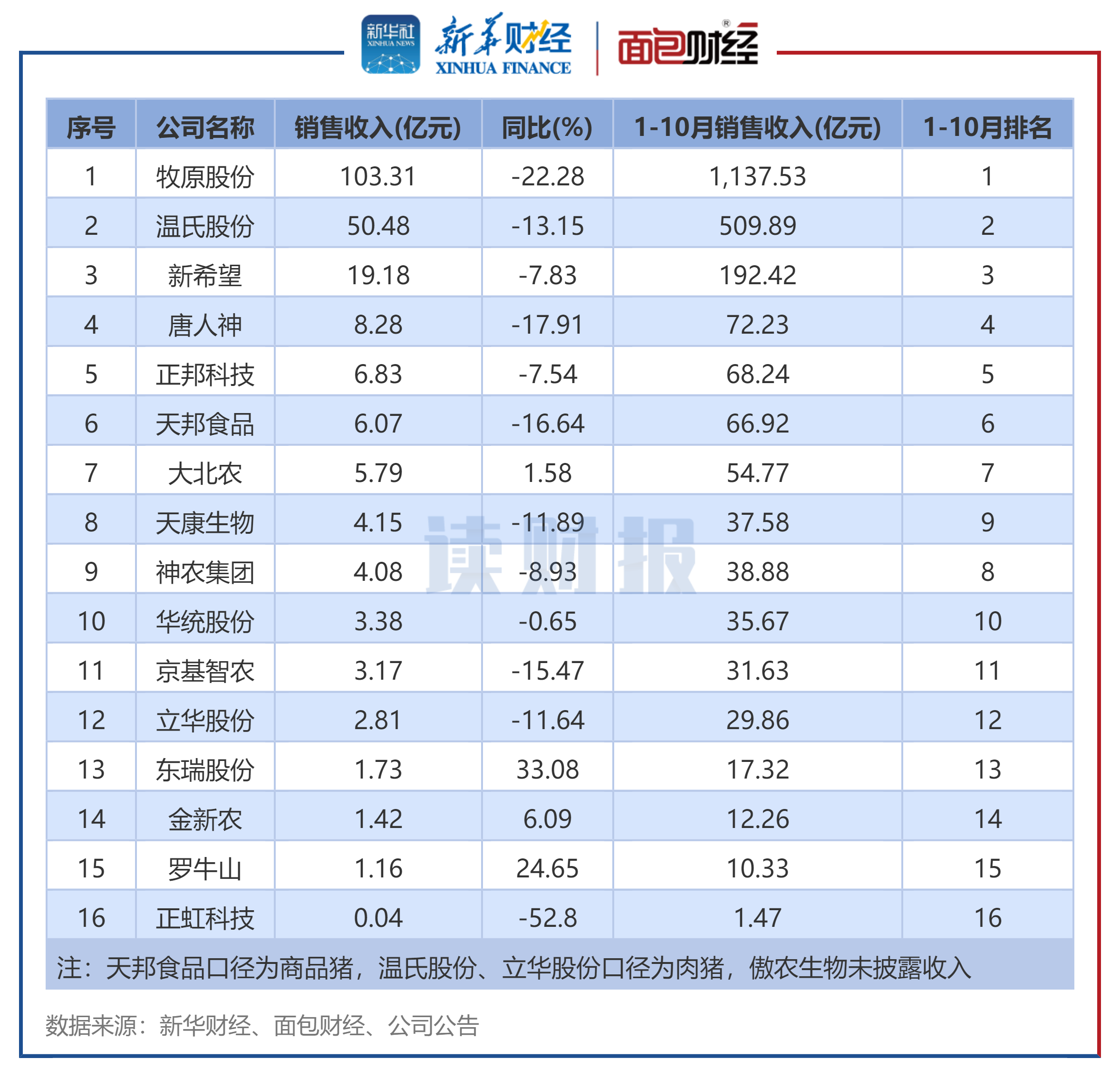 近期,生猪养殖企业10月的销售数据陆续披露。新华财经和面包财经研究员在剔除部分数据披露不全的上市猪企后,以沪、深两大交易所主要上市生猪养殖企业为样本,分别统计其生猪销售收入、销量。