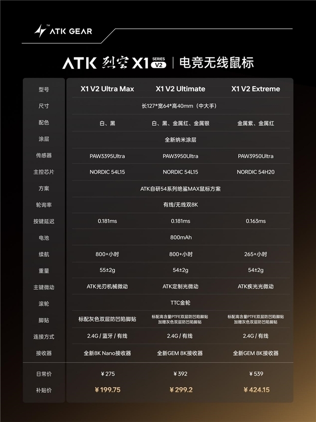 ATK 烈空X1 V2鼠标:0.163ms超低延迟,对枪快人一步