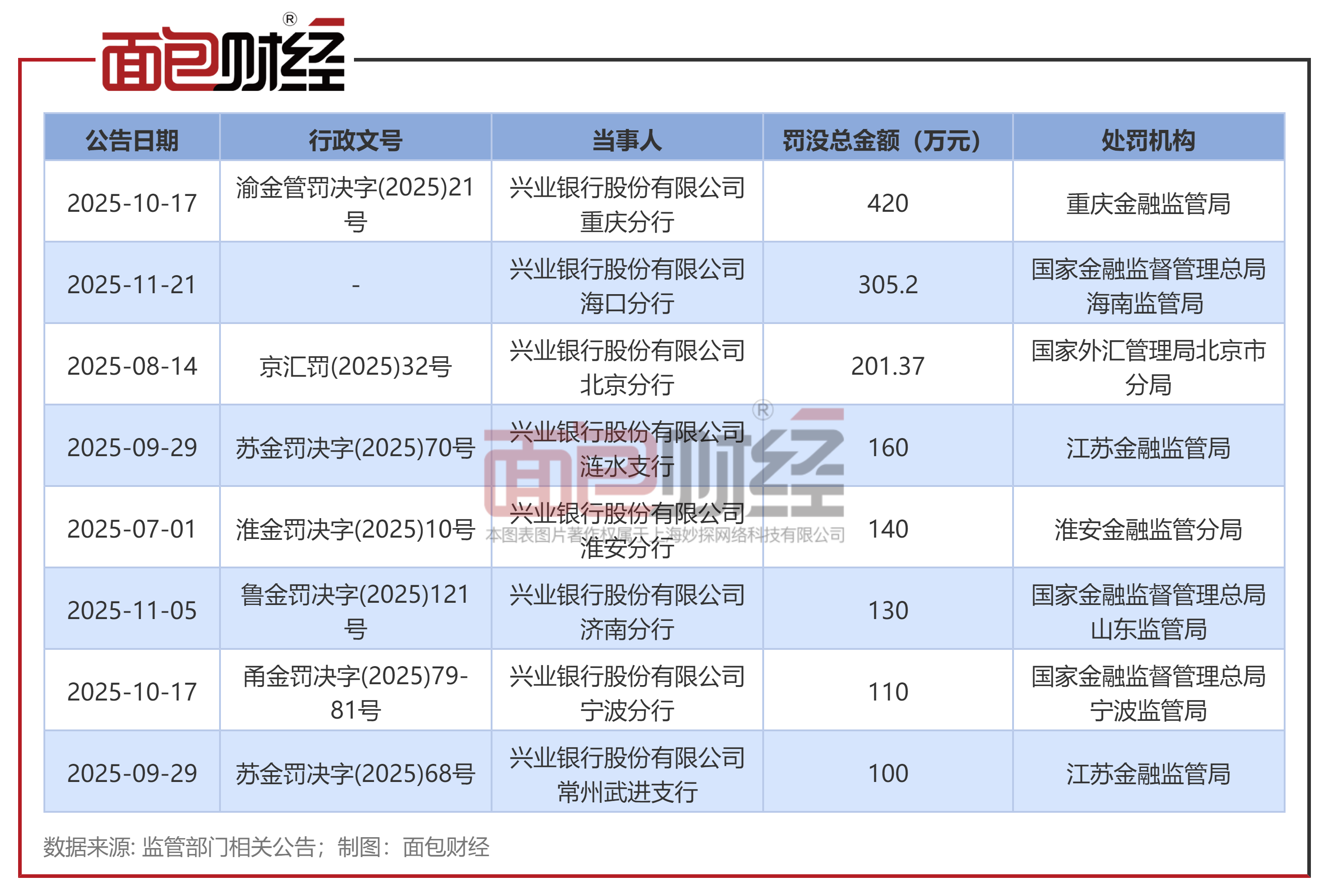 兴业银行:下半年已收到8张百万级罚单,前三季度营收下降1.82%