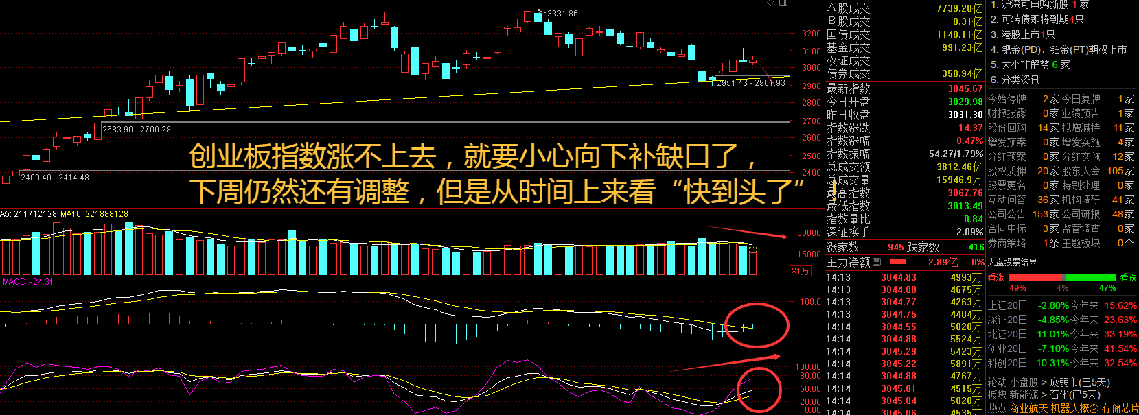 创业板指数周五出现弱势行情,勉强在5日线之上稳住,没有出现再度大涨的行情,本周还是先扬后抑的盘面为主。伴随着企业业绩逐步兑现,居民资产重新配置趋势愈演愈烈,中国权益资产性价比将进一步显现,短期市场震荡反而创造了加仓机会。骑牛看熊认为这里要注意私募加仓,公募减仓的节奏,游资比较活跃,这里还是断线热点题材为主比较“安全”。接下来注意创业板指数能否在3040点之上稳住。