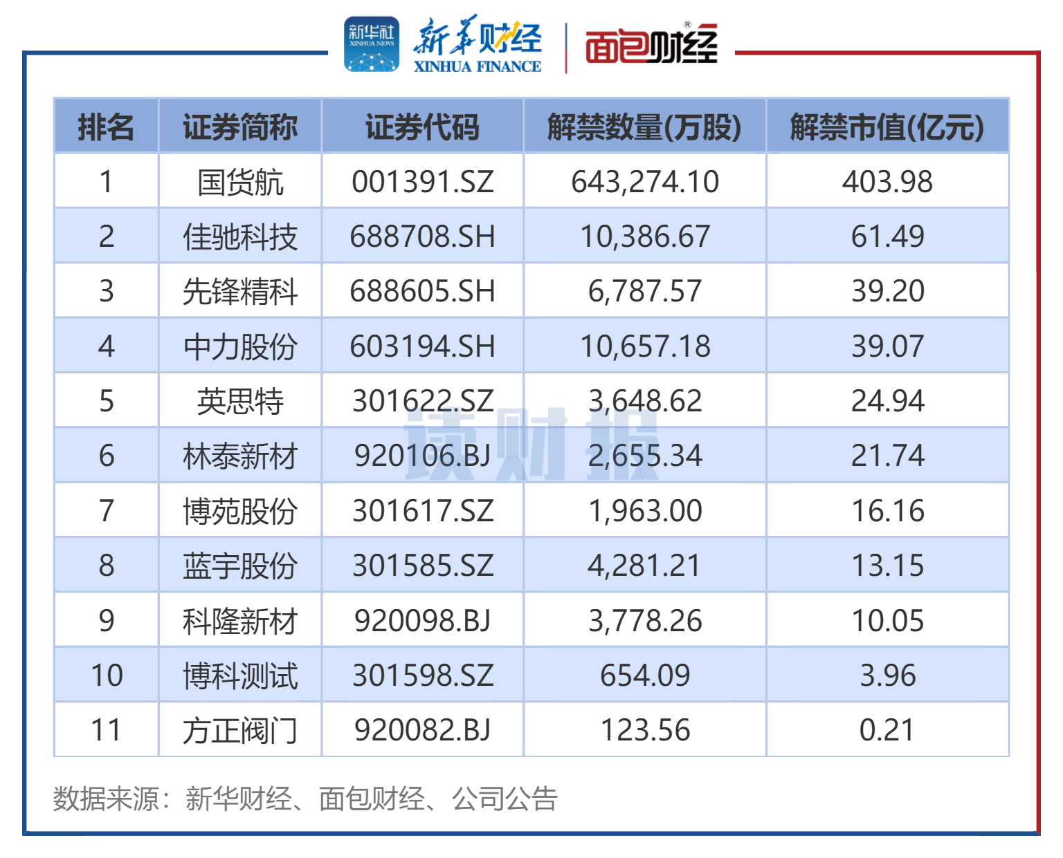 此外,共有11家上市公司、68.82亿股限售股于12月迎上市周年解禁,解禁市值为633.95亿元,包括国货航、佳驰科技、先锋精科等企业。