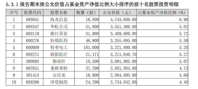 根据三季报,基金长期重仓股包括海光信息、恒瑞医药等。三季度,基金新晋重仓股包括华虹公司、浙江荣泰等。