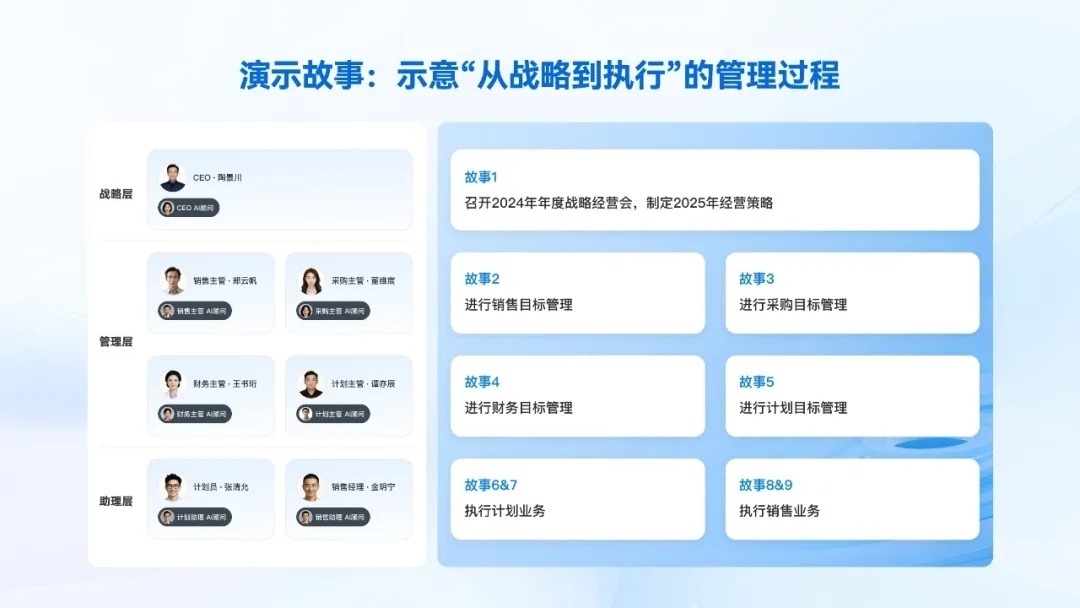 端点科技现场模拟了一家名为“时代运动集团”「从战略到执行」的AI管理过程,呈现了AI介入企业管理的九段式故事线,涵盖了三个关键场景:战略层AI、管理层AI和助理层AI。