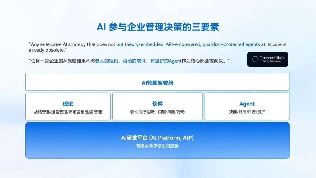 麦肯锡的AI团队QuantumBlack提出企业AI战略需建立于三个基础条件上:理论嵌入、API授权和监护规则保护。API授权确保AI与软件深度融合;监护规则保护界定AI工作权限范围:哪些事务可直接执行、哪些需授权审批。从软件工程视角,API授权和监护规则保护均属系统范畴。因此,企业AI战略的核心本质即理论、软件、智能体三环节结合。