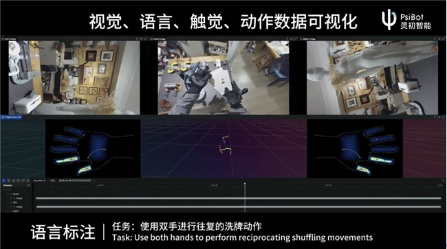 为了让这套具身数据引擎真正释放价值,灵初智能构建了完整的硬件与平台体系。由灵初智能自主研发的专为数采设计的外骨骼触觉手套,定位精度最高能达到亚毫米级别,可完整采集手部和手臂的全部自由度和覆盖全手的触觉信息,同时不影响作业人员的正常操作。此外,灵初智能自主搭建了支持大规模数据处理的管线和平台,配合自研大模型完成高精度的数据标注和后处理,形成完整的数据生产闭环。