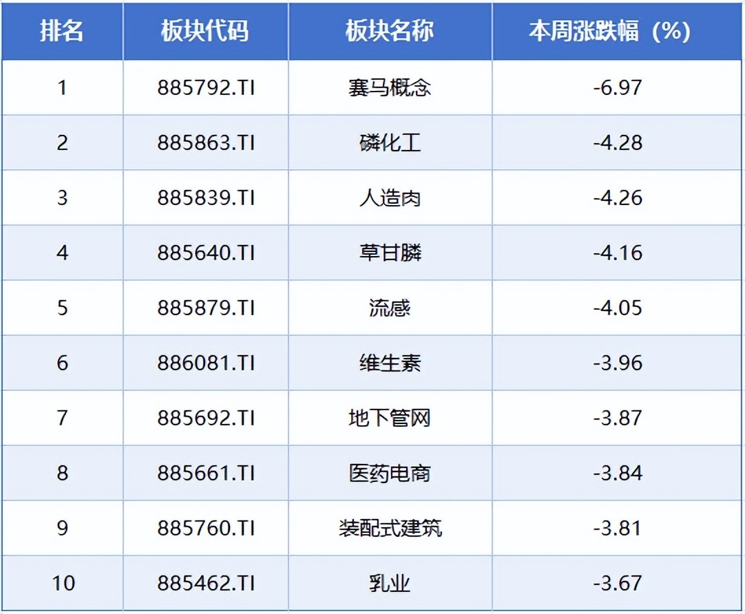 本周排在跌幅榜前排的概念板块分别是赛马概念、磷化工、人造肉、草甘膦、流感,累计跌幅分别为6.97%、4.28%、4.26%、4.16%、4.05%。