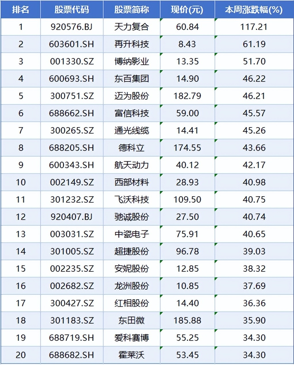个股方面,本周个股涨幅榜前五位分别是天力复合、再升科技、博纳影业、东百集团、迈为股份,累计涨幅分别为117.21%、61.19%、51.70%、46.22%、46.21%。