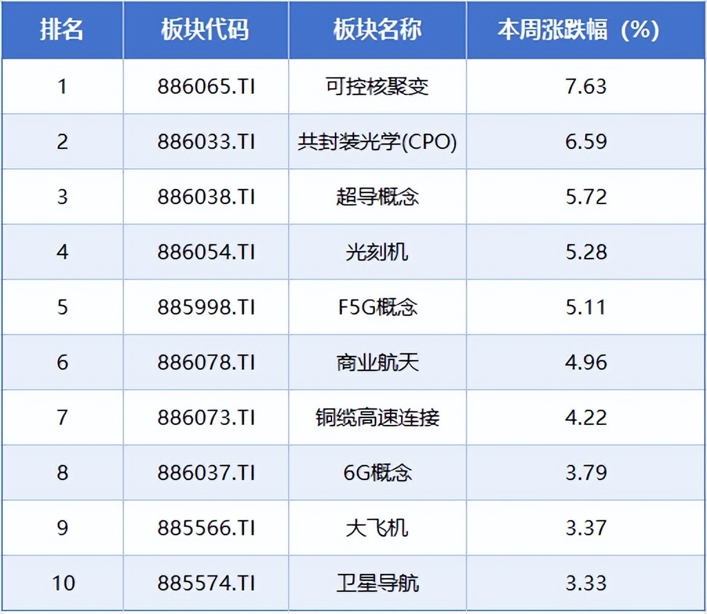 板块方面,本周涨幅居前的概念板块分别是可控核聚变、共封装光学、超导概念、光刻机、F5G概念,累计涨幅分别为7.63%、6.59%、5.72%、5.28%、5.11%。