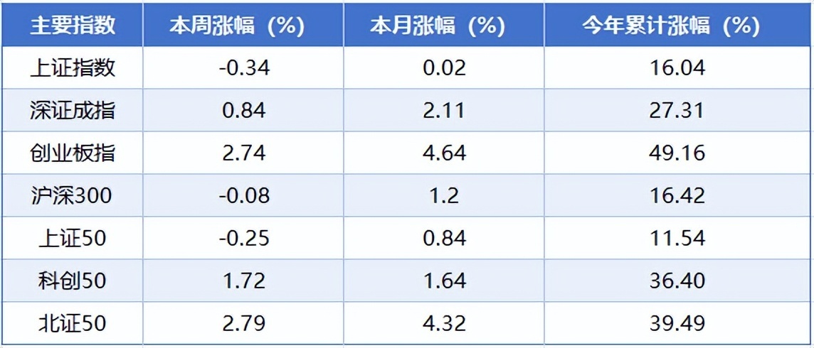 本周(12月8日至12月12日),A股三大指数涨跌互现。截至周五收盘,上证指数累计下跌0.34%,深证成指累计上涨0.84%,创业板指累计上涨2.74%。