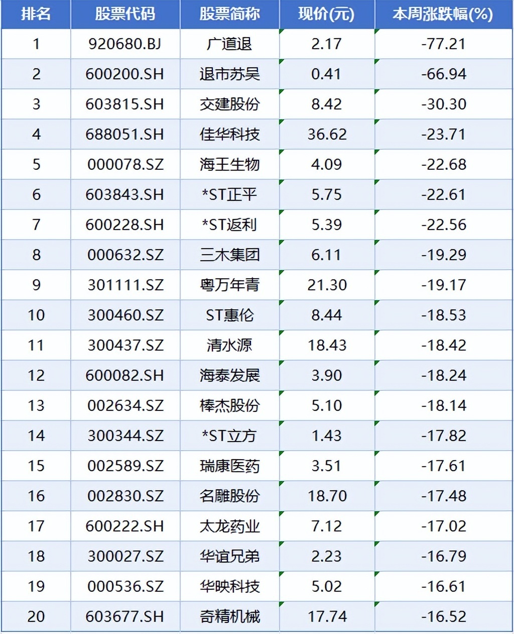 本周个股跌幅榜前五位分别是广道退、退市苏吴、交建股份、佳华科技、海王生物,累计跌幅分别为77.21%、66.94%、30.30%、23.71%、22.68%。