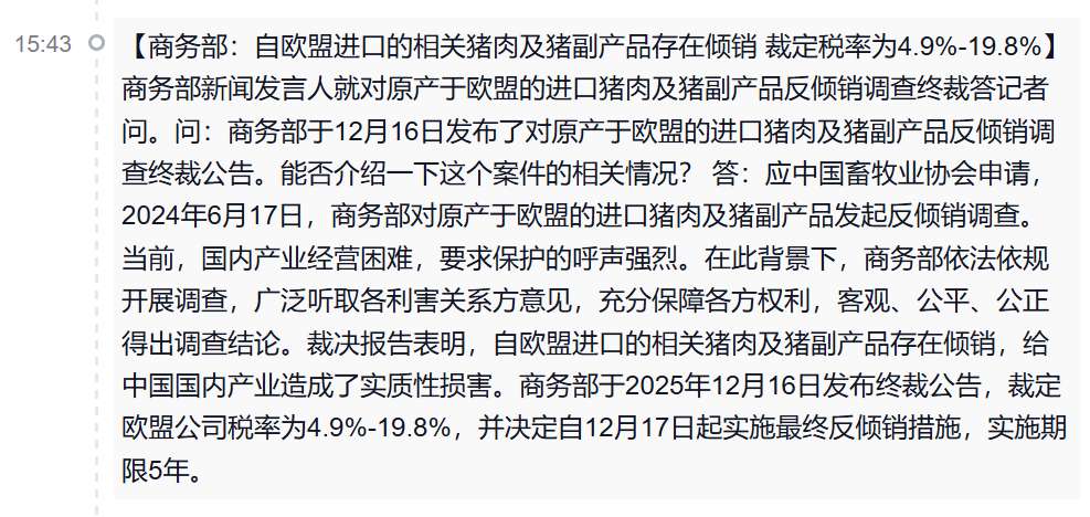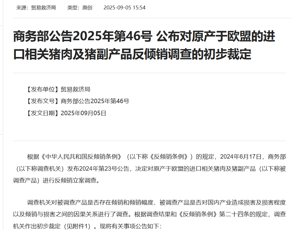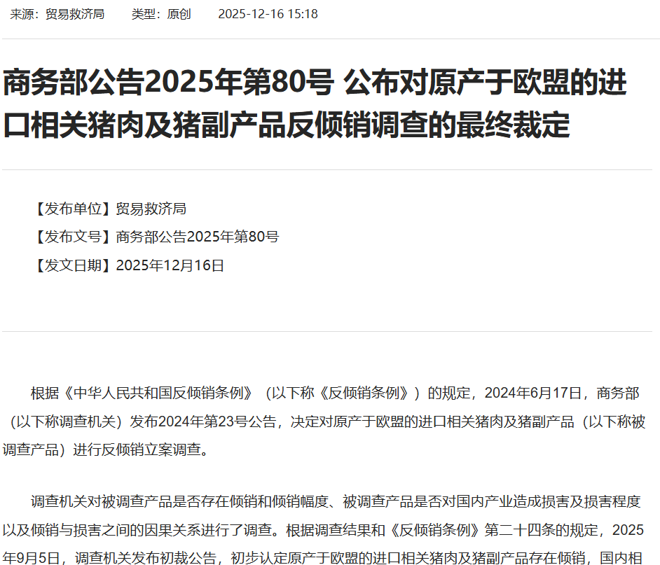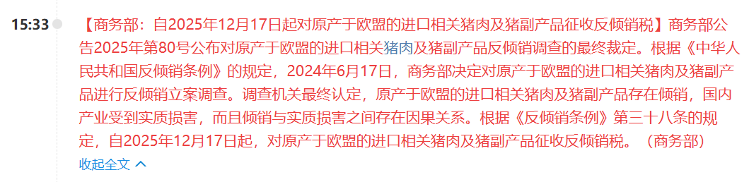 要对欧盟进口的相关猪肉及猪副产品征收反倾销税。