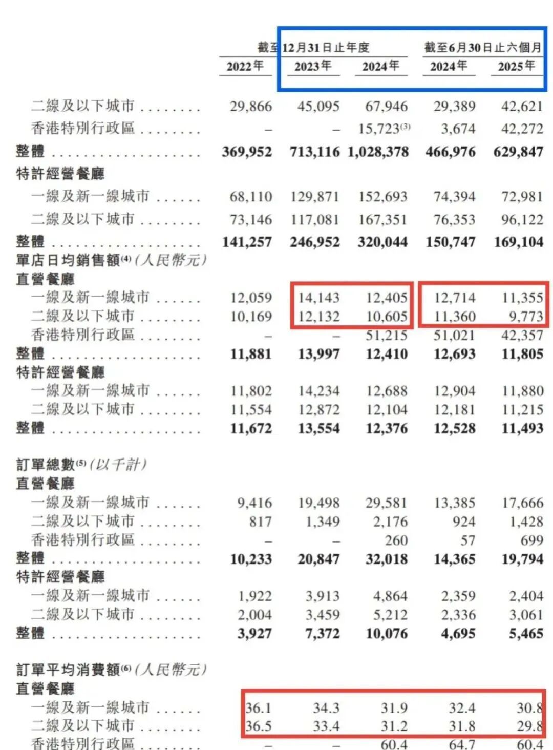 订单平均消费额从2022年的36元降至2024年的31.8元,降价幅度达11.7%。今年上半年,其直营及加盟店的整体翻座率为仅为3.4及3.1,低于上年同期的3.8及3.6。