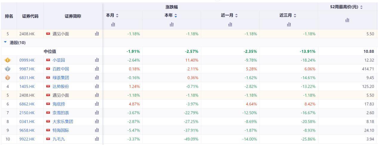同花顺数据显示,今年以来,港股市场餐饮板块表现疲软,部分头部餐饮企业股价持续下跌,市场对餐饮股的信心不足。