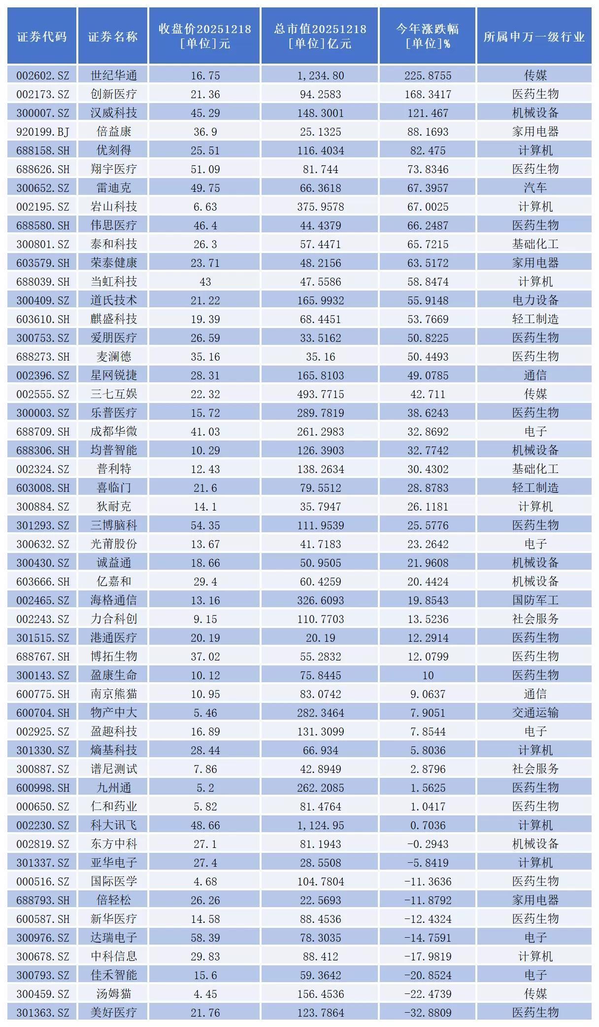 世纪华通、创新医疗、汉威科技3家公司分别以225.88%、168.34%、121.47%的涨幅位居前三。
