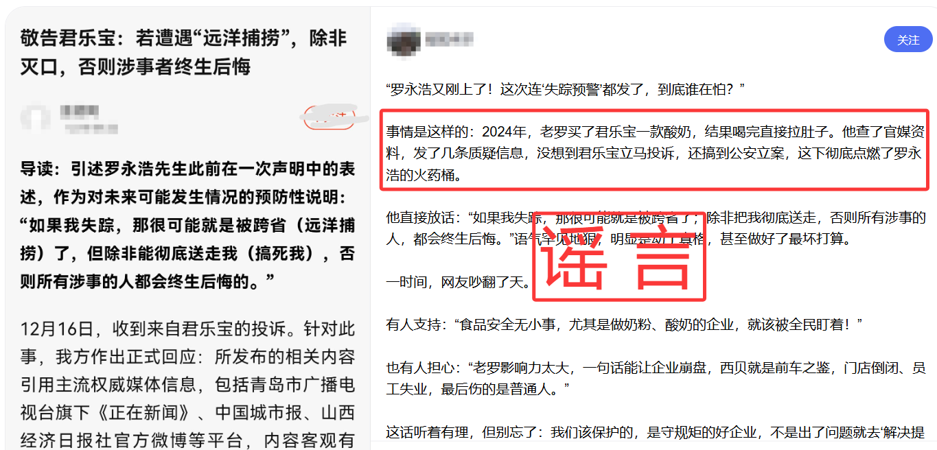 12月19日,网传一篇标题为《“罗永浩又刚上了!这次连‘失踪预警’都发了,到底谁在怕?”》帖子(以下简称“网传内容”)。网传内容表示“2024年,老罗买了君乐宝一款酸奶,结果喝完直接拉肚子。他查了官媒资料,发了几条质疑信息,没想到君乐宝立马投诉,还搞到公安立案,这下彻底点燃了罗永浩的火药桶。”